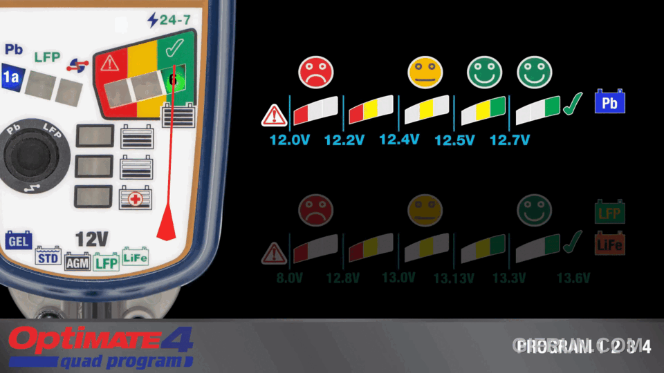 Bước 2. Chọn chương trình sạc phù hợp: OptiMate 4 Quad có 4 chương trình sạc. Bạn cần lựa chọn chương trình dựa trên loại bình (Chì-axit hoặc Lithium LFP) và cách bạn kết nối (trực tiếp hoặc qua cổng DIN CAN-bus của BMW/Ducati/Triumph).